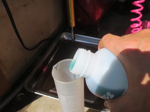 11:28 計量 それでは、開封して。 メスシリンダーに計量します。 フォーク片側あたり、約220ccの容量だそうで。 ボトルが600ccなので、1本でフォーク2本分足ります。 リーズナブルです。 |