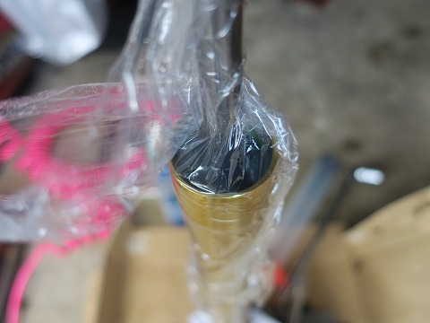13:03 しばらく放置 何度かに分けてフォークオイルを注入。 その都度、フォークを伸び縮みさせて。 ほぼ規定量の220cc入りました。 ので、ゴミが入らないようにラップして、このまましばらく放置します。 それでは、続きは昼寝の後で。(笑) (まだまだ、つづきます) |