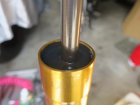 12:54 気泡が抜けてる 昼食を食べて、ガレージに戻ってきました。 GROMのフォークオイルの交換作業、続けます。 備忘録です。 さて、新しくオイルを充填した方のフォークを覗いてみると、気泡が抜けてます。 オイルの高さはほとんど変わってないけど。 もう一本のフォークもオイルを入れちゃいましょう。 |