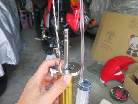 で、このドーナツの部分を、フォークの上端に当てて、突き出した部分でフォークの中に突っ込んで、注射器でオイルを抜くことによって、オイル レベルを調整しようとする工具でございます。