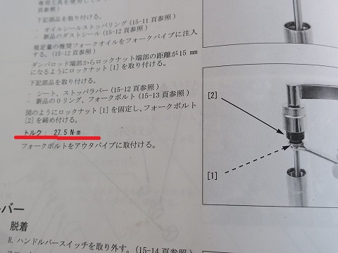 既に書かれているサービス マニュアルに文句を言っても仕様が無いので、トルクレンチを 27と半分(=27.5)に設定して、ロック ナットを締めていきます。