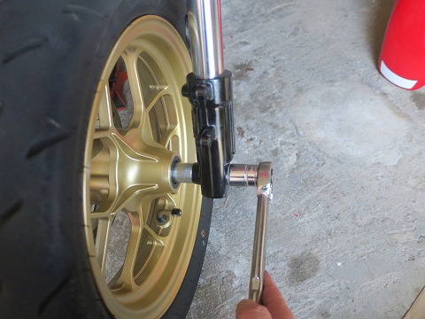 GSX-Rのフロント フォークをオーリンズに交換したときに、スレッジ コンパウンドを買ったので、固着防止にアクスル シャフトのネジの部分に塗布して組んでいきます。