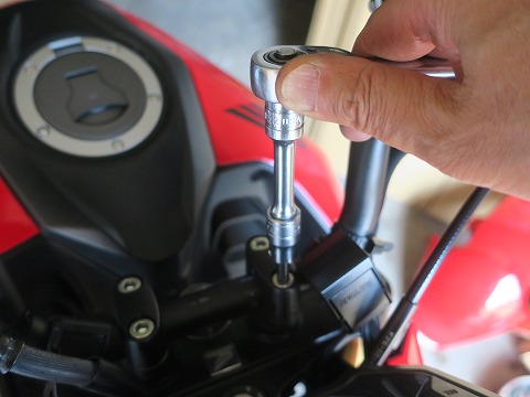 フォークボルトの締付けが終わったら、トップブリッジ側のボルトを締付け。