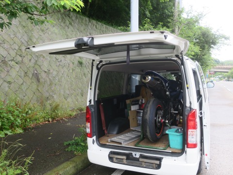 14:59 ハイエースに オイル交換の前に、まずはCBRをハイエースに積み込みます。 ハイエースの中でオイル交換をしよう。って訳じゃありません。 |