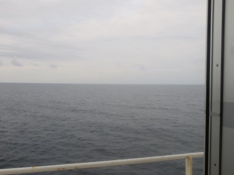 10月26日(火) 7:12 船窓から フェリーに乗船した翌日。 ちょっと前から目が覚めていました。 年寄りですから。(笑) 船内のアナウンスで何か言ってるみたいなので、寝床から這い出して、船窓から外を見ると海。 そりゃそうだ。 じゃなくて曇ってます。 しっかりと。 今日の北海道は雨の予報です。 |