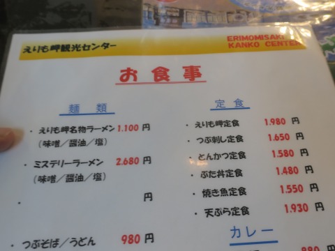12:26 ここ一択 無料の駐車場にトラックを駐めて、まずは腹ごしらえ。 襟裳岬に”何もない”ことはない。 駐車場には併設された様に”えりも岬観光センター”があります。 ただこの周辺で昼食を食べようと思ったら、ここ一択。 食べログで検索してみても宿泊する施設は何軒かあるようですが、昼食が食べられそうなのはここ一択。 ただ食べログの評価は高いこともあるので、期待して入店します。 |