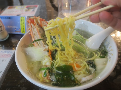 12:37 えりも岬名物ラーメン テーブルから見える半分オープンキッチンの様な作りの厨房はお客さんが少ないこともあり調理担当の人は手待ちの状態。 ほとんど待たずに5分ほどでえりも岬名物ラーメンが運ばれてきました。 カニの足や、何かの貝、海藻類が入ったスープに細く切ったネギが添えられています。 「美味しそう。」 |