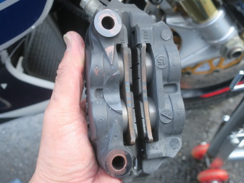 16:43 ブレーキパッドを外して 右側のキャリパーもブレーキパッドを外してピストンを出します。 |