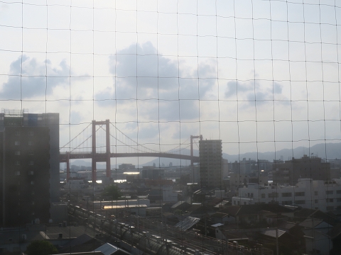 7:34 若戸大橋が 部屋の反対側にある エレベータ フロアー からは、昨晩渡ってきた若戸大橋が見えます。 窓ガラスに鉄網が入っているけど。 |