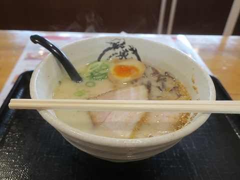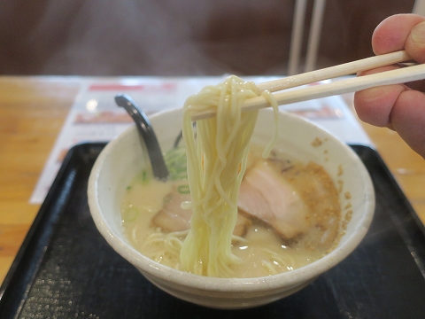 12:23 北九州ラーメン 麺は、長浜ラーメンほどじゃありませんが、ちょっと細めの中細麺。 スープは白濁した九州とんこつです。 「うん、旨い。」 このラーメンを食べていると、九州に来た感が湧きますね。 量的には替え玉の設定があることもあってか、ちょっと少なめな感じです。 替え玉追加しようかと迷いましたが、胃袋に途中で買い食いする隙間を取っておきたかったので、グッと、グッと我慢しましたよ。(笑) |
