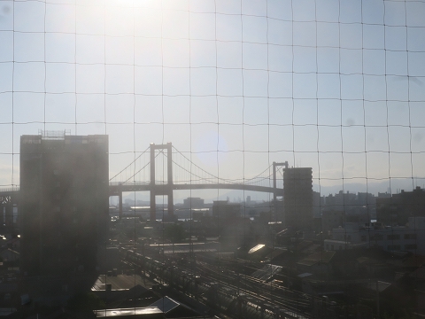 7:09 目が覚めると 朝、ちょっと前に目が覚めました。 朝食を食べに、1階のレストランに向かいます。 エレベーターホールから見える若戸大橋は今日も健在です。 できれば窓の外側をきれいに拭いておいて欲しいところです。 |