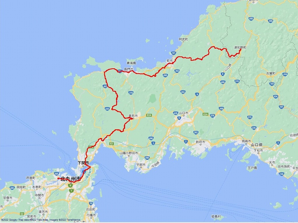 | 午後の道程:津和野~萩~長門~豊田湖~美祢~小月IC~関門橋~北九州市若松:199.87 km | |