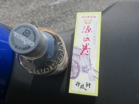 15:41 源氏巻を で、気が付いちゃったのはリヤシートにくくり付けてあった”源氏巻”。 たぶんおやつ。 見たことないけど。 飲物を買って食べちゃおうかなぁ~。(笑) |