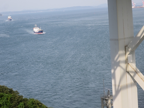 16:12 行き交う船は 関門橋と言うか、関門海峡の一つの特徴が潮の流れの速さでしょう。 海峡を行き交う船のうち、潮の流れに逆行する船は結構な航跡を残しているにもかかわらず、船はノンビリと進んで行きます。 普段見慣れている船と動きが違うので、脳が軽いパニックを起こしそうです。 鳴門海峡でも同じ様な風景を見ることはできますが、関東圏では見ることができませんね。 |