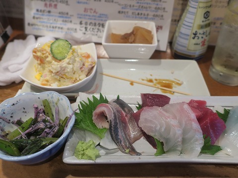 刺し盛りはお一人様向けに4~5種類のお刺身を2、3切れずつ盛ったもの。
