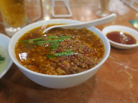 スープは比較的澄んでいる感じで、大きめの炒めた挽肉がたくさん入っています。