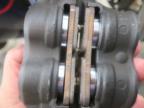 9:08 パッドを確認 なので、リボンが貼ってある方のホイールに入れ替えてみます。 まずは、ブレーキキャリパーを外して。 パッドの残量はまだ大丈夫ですね。 パッドの残量が減ってきたときに(パッドが反って)チャタが出ることもあるみたいですが、気温の高い真夏じゃないしね。 パッドを交換するのはサーキットでも出来るし、後回しにします。 |