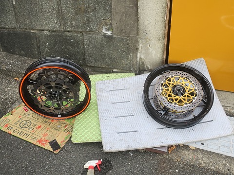 9:23 タイヤを外す ので、左側の昨日走行したタイヤを外して、右のリボン付きのホイールに履き替えます。 で、まずは両方のホイールからタイヤを外しました。 |