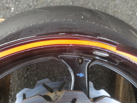 9:26 タイヤをはめる ローテションマークを確認して、リボン付きのホイールに昨日走行したタイヤをはめていきます。 |