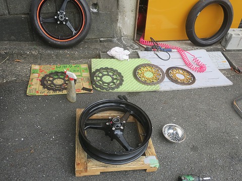 9:41 ブレーキディスクを陳列 両方のホイールからディスク版を取り外しました。 ディスクプレートを並べる。(笑) リボンが貼ってない方のホイールは後でタイヤを入れましょう。 とりあえず、次回走行用のリボン付きのホイールが優先で作業します。 |