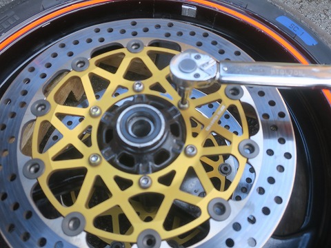 9:49 ディスクを取付け bremboのディスクを取り付けて、トルクレンチで締め付け。 |