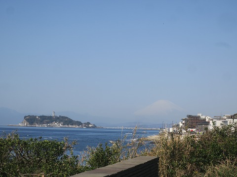 信号で停められたタイミングで、江ノ島とボンヤリと見える富士山をデジカメに収めます。