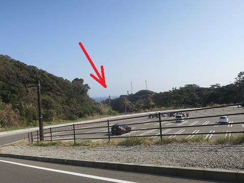 先ほどの写真の交差点から走ること10km弱、”石廊崎オーシャンパーク”の看板にしたがい県道を左折、廃墟となった観光施設を左手に1km弱進むとオーシャンパークの駐車場の向こうにちょこっとだけ頭を出している灯台が見えてきました。