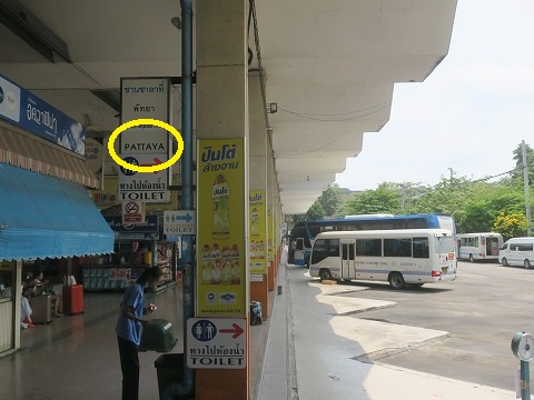 13:34 PATTAYA行きの乗車口は チケット売り場を確認したら、乗車口を確認。 バスが発着するエリアにきました。 行き先毎(券売所毎)に発着場が決まっているみたいで、さっきのPATTAYA行きバスの乗り場は、”PATTAYA”って書いてある、ここみたい。 PATTAYA行きのバスはこの時間だと1時間に2本ぐらい出ているみたいです。 で、さっきのチケット売り場には、今買うと乗車できる直近の時間が書いてありましたが、待ちは無いようです。 なので、ギリギリに来ても大丈夫そうです。 次のバスは14時ちょうど発。 バスが来るまで待ちましょう。 その間、他も見て回ります。 |