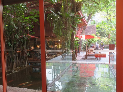 15:18 建物の外は ガイドさんによる内部の説明は30分程で終わります。 後、建物の外は自由に歩き回れます。 建物自体、JIM TOMPSON がタイの地方から運ばせたものだそうで、タイの古典的な高床式の住居となっています。 高床式の住居になっている理由は2つ。 一つは、雨期になって洪水になる可能性があり、1階部分は水浸しになるため。 もう一つは、野生動物から身を守るため。 タイのローカル地方であれば、昔はトラとか普通に居たみたいですから。 なので、元々家には階段がなくて、ハシゴで出入りしていたそうです。 建物の内部にはクラーは入っていませんが、風が通るので耐えられない暑さではありませんでした。 外は暑いです。(^_^; |