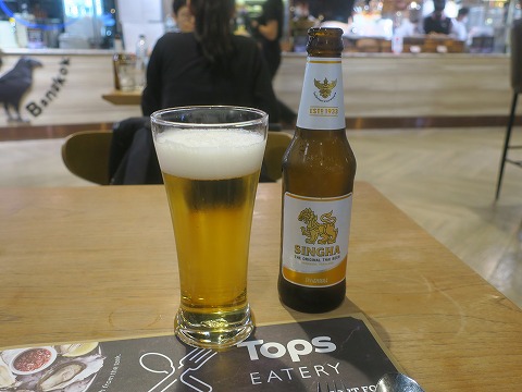 19:56 夕食は 夜7時になって、ぼちぼち嫁さんから連絡が入るだろうと、central ChitLom まで戻ってきました。 で、スマホ(viber)に連絡が入って。 「渋滞で遅くなるので、先に食べてって。」 あら、残念。 夕食もボッチになりました。 ので、夕食は初日の夕食にも訪れた central ChitLom 内にある Tops food hall へ。 まずは、ビールでShingha、小瓶で48バーツ → 約180円。 |