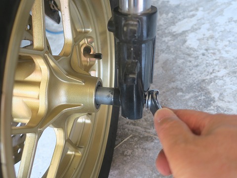 10:24 三つ叉のピンチボルトを フロント タイヤを外す前に、フロント フォークを押さえているアンダーブラケット(三又)のピンチ ボルト左右を緩めておきます。 |