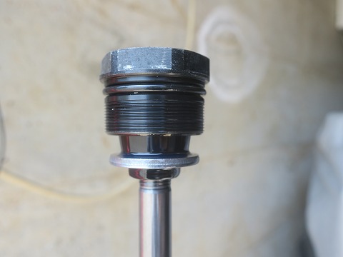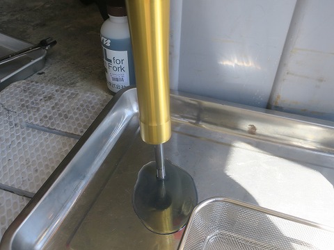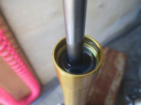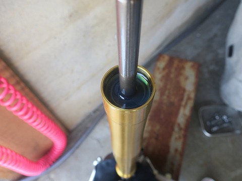 14:42 オイルを入れたら 何回かストロークさせてオイルが入りました。 フォークのダンパー内のエアーを抜く方法がありますが、写真だと説明が難しいので省略。(笑) 実際に作業する人は、”グロム フロントフォーク エアー抜き”で検索すると簡易の真空抜きの方法が YOUTUBE に出てくるので参考にしてみては。 さて、規定量を入れたら、オイルの量はアウターの上端から75mmになることになりますが、多めに入れたのと、エアーが抜けてないので液面は規定より高いです。 |