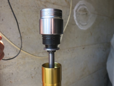 14:35 オイルを入れる オイルを入れていきます。 ダンパーにオイルが回らないので、いっぺんには入りません。 フォークをフルストロークしておいて、ギリギリまで入れたら、フォークをストロークさせて、エアーを抜いてダンパー内にオイルを回していきます。 フォークをストロークさせるときに、引っ張りすぎに注意です。 インナーの上の方、側面にオイルが通る穴が開いているんですが、思いっきり引っ張るとダストシールから穴が下に出ちゃうんで、そこからオイルが漏れちゃいます。 (-_-;) (やらかしちゃった本人が言うんだから、間違いありません)(爆) |