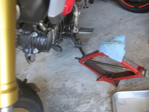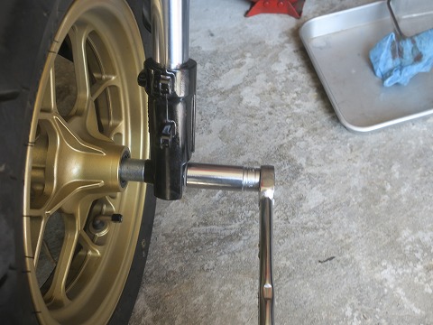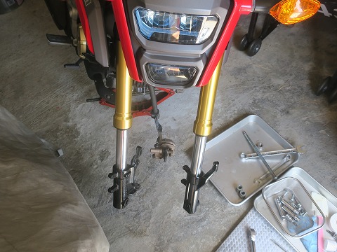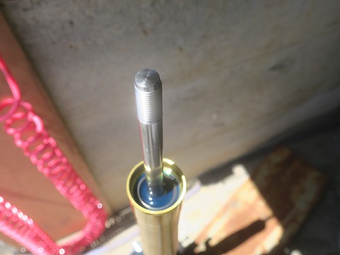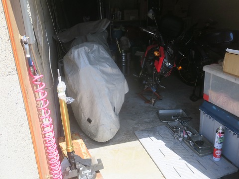 10:01 昨日の続き フロントフォークのオイル交換作業の続きです。 昨日、フォークオイルをこれまでより柔らかいKYB社製のG20Sに入れ替えて、エアー抜きのため、1晩放置しておきました。 |