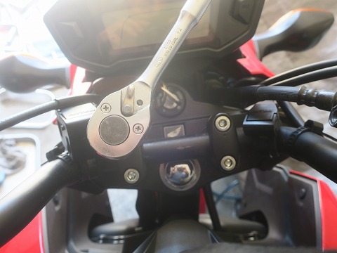 10:20 キャップ ボルトを締め付け キャップ ボルトを取り付けたら、規定トルクで締め付け。 本当は、下のナットはスパナで固定して締めるんですけど、手が2本しかないもんで、写真を撮るときだけスパナは省略。(笑) |