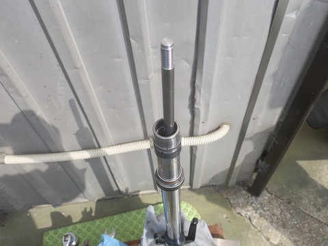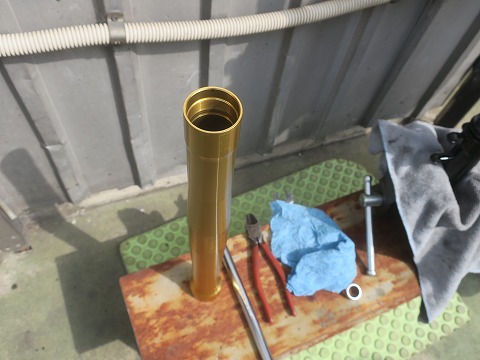 インナーのアンダーブラケットに万力を噛まして、アウターパイプを強くストロークさせて引き抜きます。