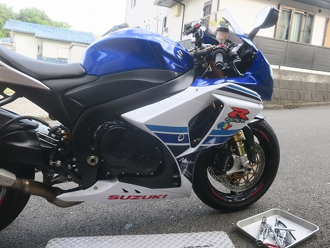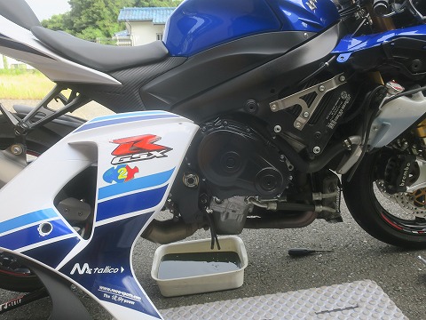 15:18 4,000kmサイクルに 沖縄訪問直前に行ったK2Y主催の栃木県内ツーリングでGSX-Rの走行距離が 40,000kmを超えました。 これまでオイル交換のサイクルは 3,000kmの倍数で行ってきましたが、今回から 4,000kmの倍数(いわゆる4,000km毎)に変えました。 (サービスマニュアルでは、6,000km毎もしくは1年毎となっています) 今日は、走行距離 40,000kmを超えたので、オイル交換します。 土曜日の午後、日差しが少し傾いて、作業エリアが日陰になったところで、ガレージからバイクを引張り出して作業を始めます。 |