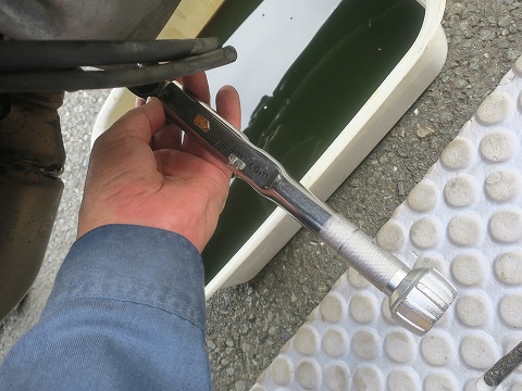 16:01 トルクレンチを使って ワッシャーを新品に交換したら、ドレンボルトを取付けます。 最後はトルクレンチを使って規定トルクで締め付け。 |