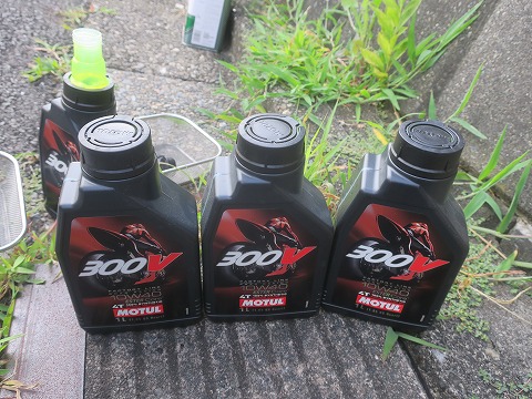 16:22 オイルは 新しい、オイルを準備。 これまでと同じ MOTUL 300V の 10W-40 。 今回はオイルフィルターも交換したので、オイルだけの交換よりちょっと多め。 マニュアルを見ると 500ccくらい多いみたい。 と言うことで、使いかけと合わせて4本準備。 |
