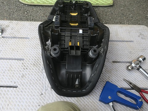 16:35 カットしてみる ハサミで適当にカット。 ホント、適当だね。(笑) これで、下準備は完了。 平日は仕事に行くのに使っているので、今日の作業はここまで。 リヤのトップケースを元に戻して終了です。 来週末、ホームセンターに行ってタッカーを買ってきてから作業ですね。 |