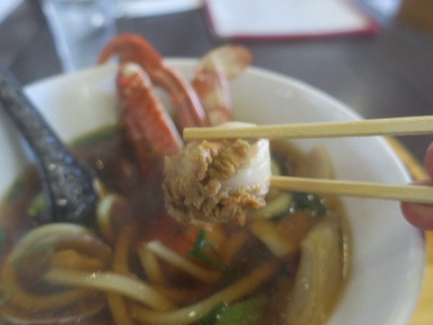 12:16 カニは カニはワタリガニ(ガザミ)の半身。 ハサミでうどんを掴んでいるのは最後の執念じゃないと思う、。(笑) ワタリガニは美味しいけど、あまり食べるところがないんですよね。 |