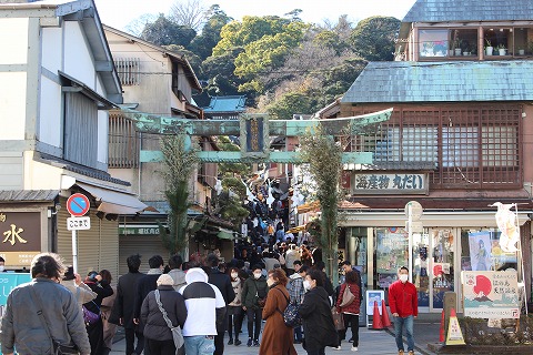 11:11 参道です それでは、灯台に向かいます。 江の島には江島神社があって、神社を中心に街並みが造られている感じです。 江の島にある神社は”の”が無くて江島神社と書いて、”えのしまじんじゃ”と読みます。 江の島灯台には参道を通って行きます。 入口には青銅製の三の鳥居がお待ちしています。 その先、道の両側には飲食店やお土産屋さんが並んでいます。 今日は正月4日で、初詣に訪れた人で溢れかえっています。 |