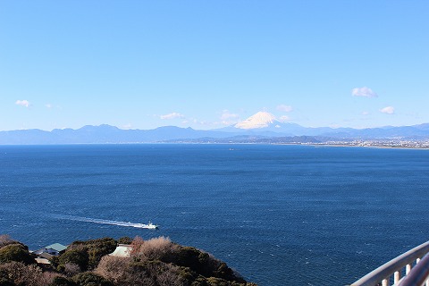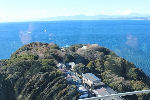 11:49 ガラスが 360°の展望、グルっと回って西側に。 駿河湾を挟んで、対岸に富士山が見えています。 右上の方ね。 コントラストがはっきりしてないので、わかりにくいですが・・・。 正面は箱根とか伊豆の山々。 足元の岬の先っちょの方に見えるのが、江島神社の奥津宮だしょう。 ここから見ても、ちょっとアップダウンと距離があるので、足が遠のくね。 ここで写真を撮っても、ガラスが写りこんじゃうので、屋外展望フロアーに上がりましょう。 |