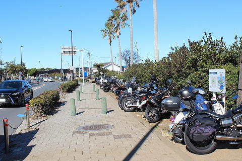 12:36 バイクのところに 江の島をうろうろしてバイクを駐めてあるところに戻ってきました。 この裏にもバイクを駐められる場所があります。 こうして見ると、バイクできている人も多いんですね。 ちなみに22時以降〜朝5時までは車両進入禁止です。 |