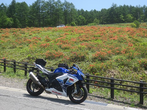 13:55 湯ノ丸高原の つまごいパノラマラインから県道94号線に戻り、地蔵峠に向かい南下中。 行きに写真を写した湯ノ丸高原のレンゲツツジ群落で、また写真を撮ってみます。 オレンジ色って、離れるとはっきり写らないですね。 ところで、自分はどこで写真を撮っているんでしょうね。(笑) |