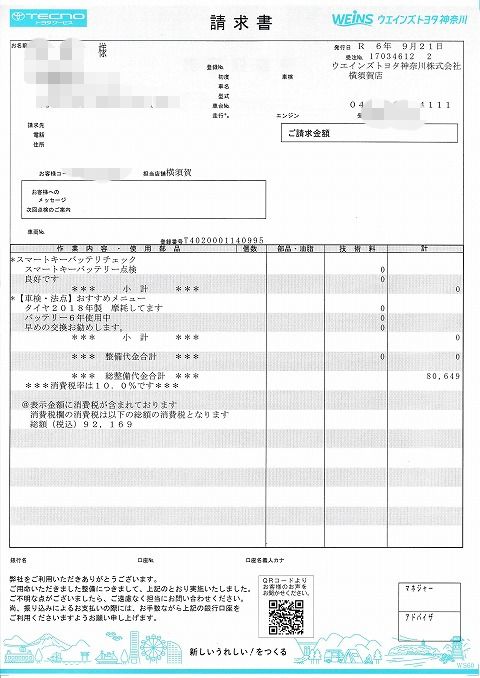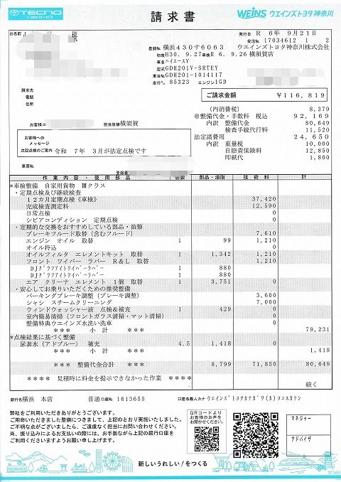 車検内容は 日中、都内に用事があって5時過ぎに横須賀に戻ってきました。 電話をすると車検は終わっているとのことだったので、引取りに行ってきました。 車検費用はご覧の通り 12万円弱。 去年よりは少し安くなりましたけど、毎年10万円超の費用は辛い。 (+_+) 点検内容は、(ディーラーお薦めの)標準的な車検整備。 それにオイル交換。 オイルは結局前回の車検から途中1回も交換しませんでしたね。 以前はだったら、途中3回くらいセルフで交換してたのにね。 オイルはペール缶で買ったものが自宅にありましたので、持込み ワイパーブレードは去年まではカー用品店で買ってきて自分で交換してましたが、面倒なので今回はディーラーにお願いしました。 ブレードの1本880円って言うのはまあ分かるけど、工賃が1,210円って言うのは高いね。 見たところ最低の工賃が1,210円なのかな。(知らんけど) エアークリーナが汚れているので交換を勧められました。 去年から5〜6千キロしか走ってないのに、と思いましたが、去年はエアークリーナーを交換してなかったんですね。 後、ウォッシャー液を補充。 これも自分で買ってきて補充すれば安くあがりますね。 結局、面倒臭がることに対して、お金で解決していることになるかな。 そして、アドブルーを補充。 以上で、今年の車検は終了です。 あまり距離を乗らなくなったこともあって、車検費用の高さを感じますね。 来年辺りは、ユーザー車検でも検討してみるかな。 (おわり) |