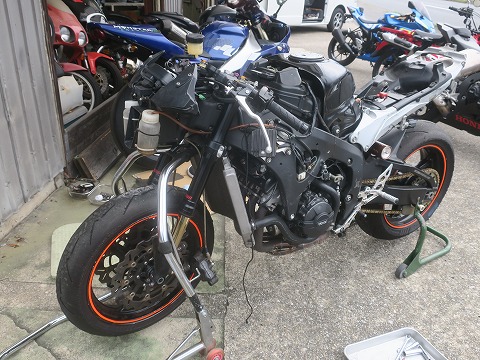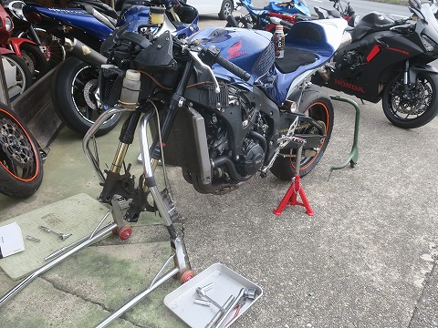 14:14 不要なものは とりあえず不要なものは外せたかな。 このあと、三又を外すので、フロントのレーシングスタンドは使えません。 さて、どこでフロントを支えるスタンドを通しましょうか? |