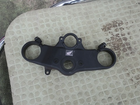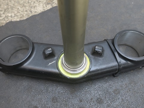 14:32 三又を フロントを浮かせたら、ダスト シールを外して、アッパーベアリングのインナーレースを外すと、下側から三又が抜けます。 上側のベアリング(アッパ ベアリング)が見えました。 |