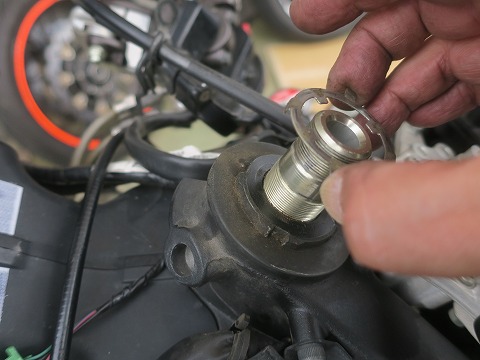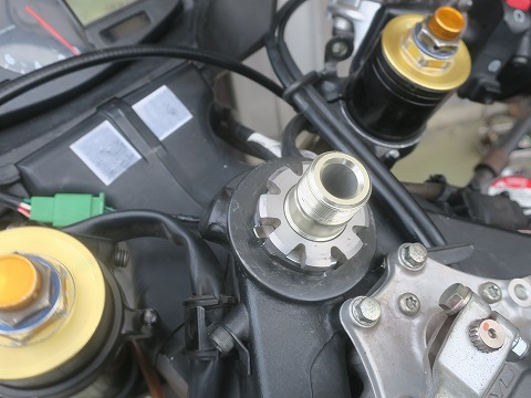 14:23 ロック ナットが ステアリング 捨て宇 ナットを外したら、トップブリッジを外します。 トップブリッジを外すとロック ナットが現れます。 |