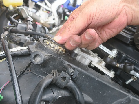 17:05 忘れずに TZのフロントスタンドを架けるために外したラジエータのボルト。 サービス マニュアルには無い項目なので、ラジエータを取付けて締め付けを忘れずに。 |